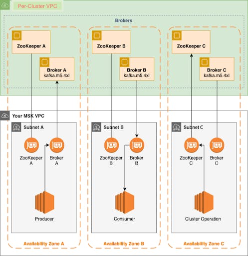 This diagram provides a visual representation of how Amazon MSK (Managed Streaming for Apache Kafka) operates. It showcases the per-cluster VPC (Virtual Private Cloud) structure, broker and ZooKeeper instances, and how different components interact across multiple availability zones.